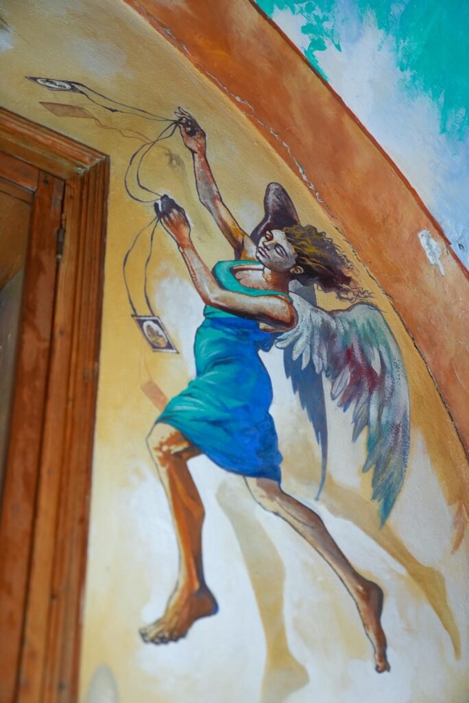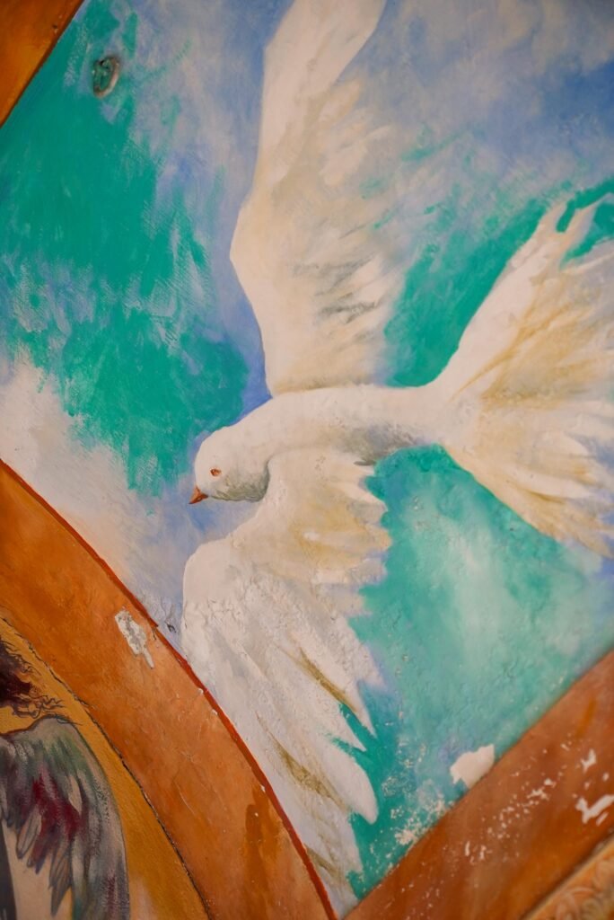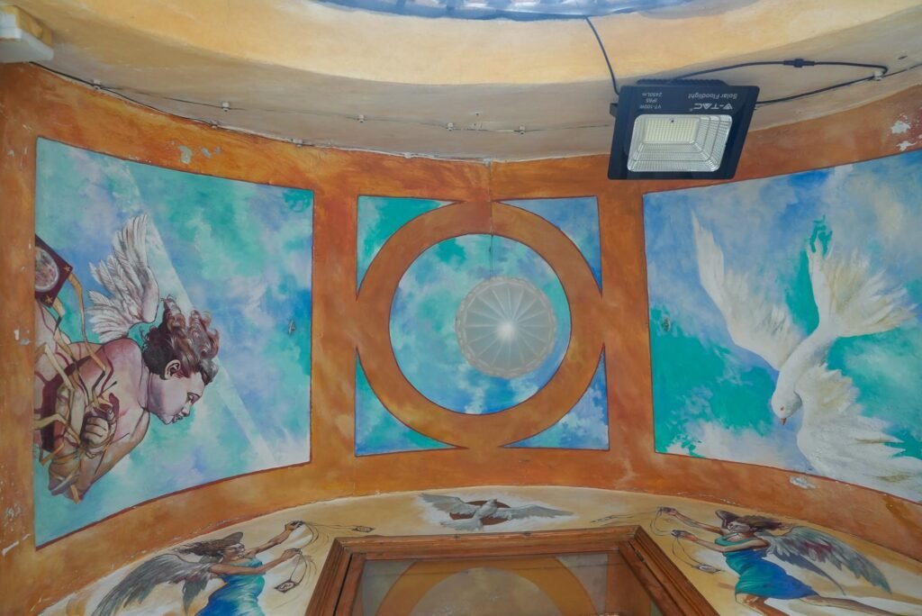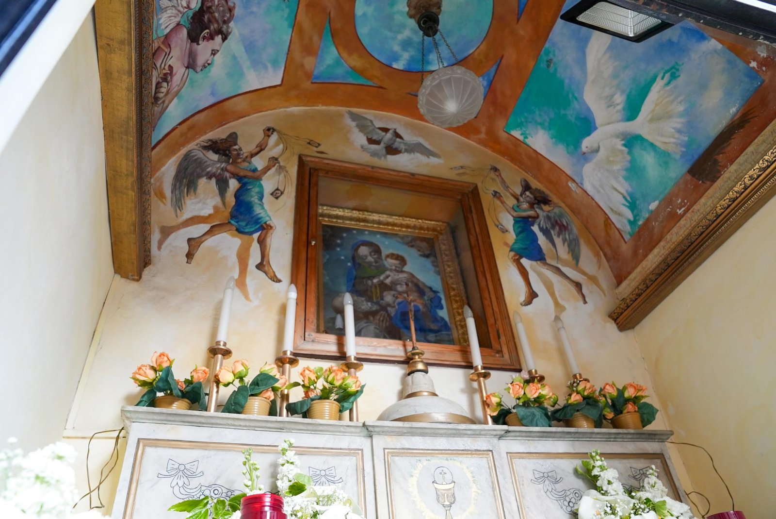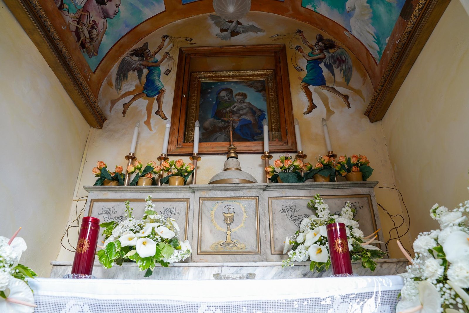 Il volto della Madonna, dolce ma maestoso, richiama la forza espressiva dell’arte michelangiolesca, conferendo alla scena una straordinaria intensità emotiva. L’ambiente semplice e raccolto invita alla preghiera silenziosa, creando uno spazio dove arte e spiritualità si fondono.
