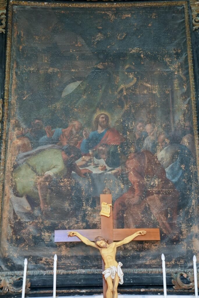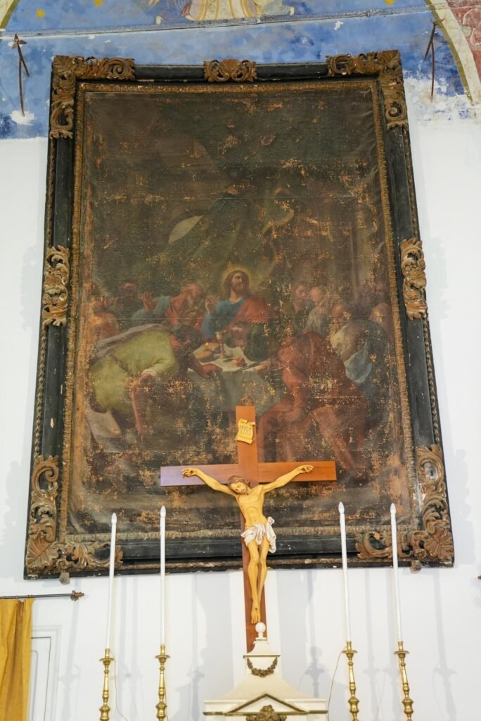 In passato, l’oratorio vantava un altare in marmo policromo, oggi scomparso, insieme a altari laterali in gesso. Tuttavia, alcuni elementi barocchi di grande valore storico-artistico sono ancora visibili: stucchi, affreschi e una maestosa tela seicentesca dell’Ultima Cena, di notevoli dimensioni e raffinatezza pittorica, che ancora oggi cattura lo sguardo e invita alla contemplazione.