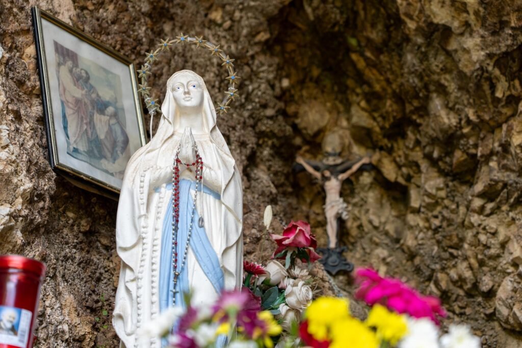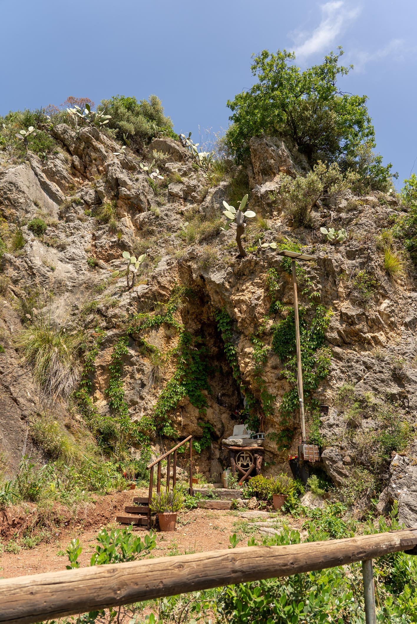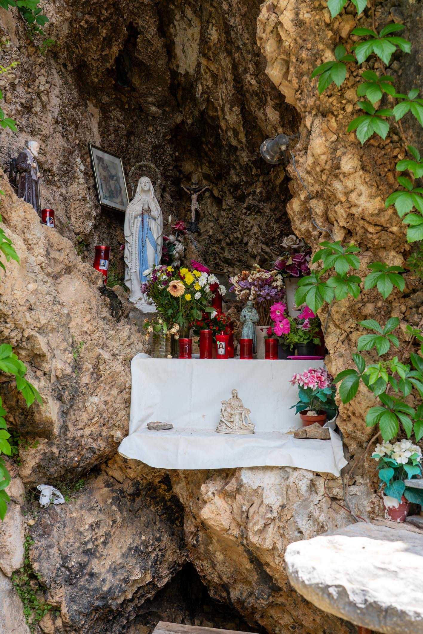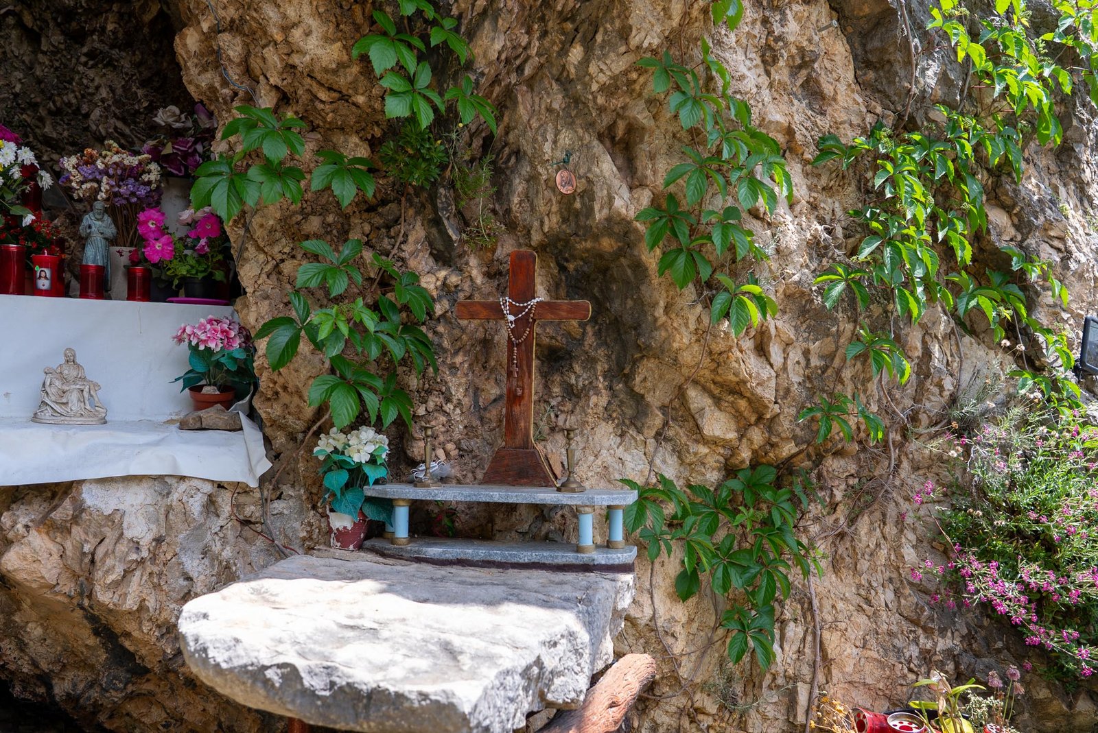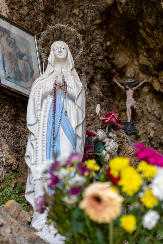 Al centro della grotta si erge la statua della Madonna, adornata da rosari e circondata da fiori e candele votive, simbolo della fede popolare. Sulla roccia sono visibili anche una croce lignea e alcune immagini sacre, che arricchiscono questo spazio di preghiera spontanea e partecipata.